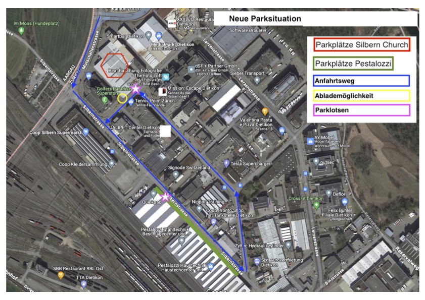 Die Parkplatzsituation hat sich bei uns verändert. Deswegen bitte wir euch, die Wegweisung der Parklotsen zu beachten. Die ersten 39 Fahrzeuge werden direkt beim Pestalozzi geparkt. Ihr könnt dann bequem zu Fuss zur Silbern Church laufen (5 Minuten). Die restlichen Fahrzeuge werden vor der Hofeinfahrt auf die weiteren Parkplätze verteilt.